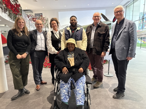 Honeycomb Group Charitable Services Board Chair Alice Hemsley-Myers, Executive Director of Finance Greg Van Enk-Bones, Chief Executive Julie Guildford Smith, Resident Ivy and her son Justin, Board Member Tim Edwards and Chair of the Board Peter Hay,